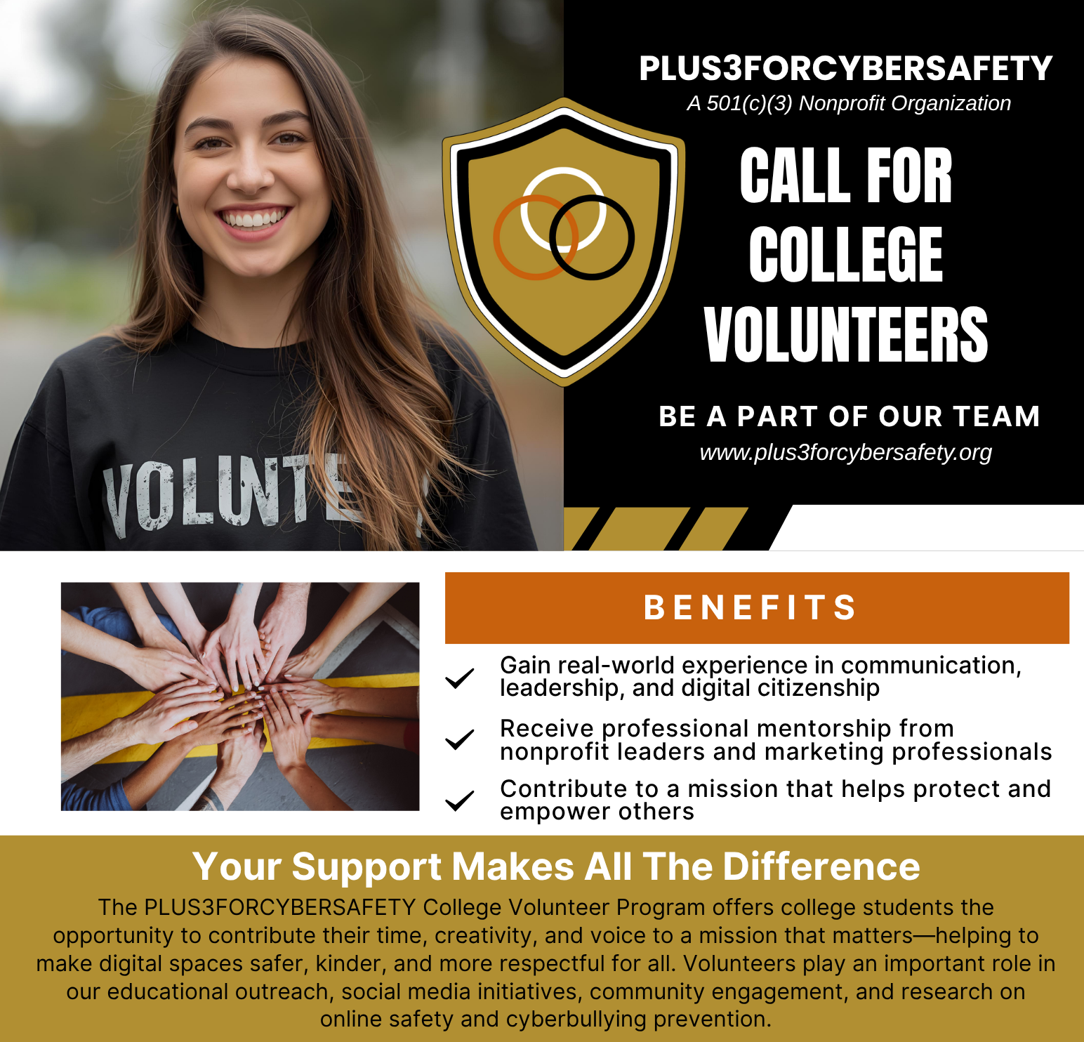 The PLUS3FORCYBERSAFETY College Volunteer Program offers college students the opportunity to contribute their time, creativity, and voice to a mission that matters—helping to make digital spaces safer, kinder, and more respectful for all. Volunteers play an important role in our educational outreach, social media initiatives, community engagement, and research on online safety and cyberbullying prevention.
